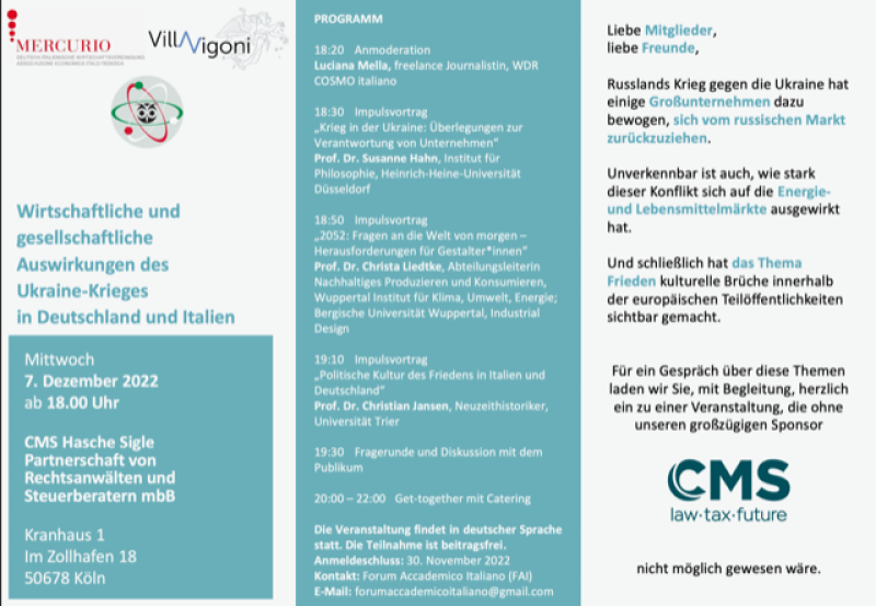 il FAI è lieto di comunicare che giorno 7 Dicembre 2022 a partire dalle ore 18:00 presso la sede della CSM Hasche Sigle (Kranhaus 1, im Zollhafen Colonia) avrà luogo un dibattito pubblico sulle ripercussioni della guerra tra la Russia e l’Ucraina nell’economia e nella società italiana e tedesca (la lingua del dibattito e' il Tedesco). L’iniziativa è stata realizzata dal FAI insieme a Villa Vigoni e Mercurio.